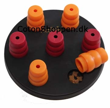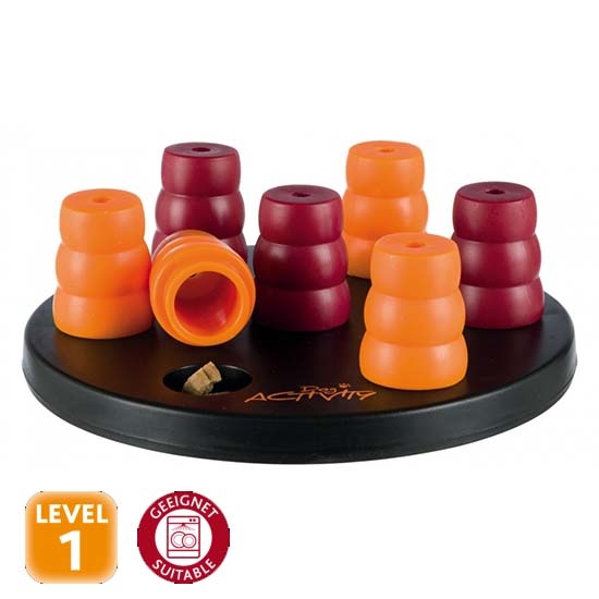 Spillet består af en rund spilleplade med syv kegler. Under hver kegle kan du gemme godbidder eller tørfoder. Herefter skal hunden finde ud af, hvordan den får flyttet keglerne for at blive belønnet med godbidderne, du har lagt i.