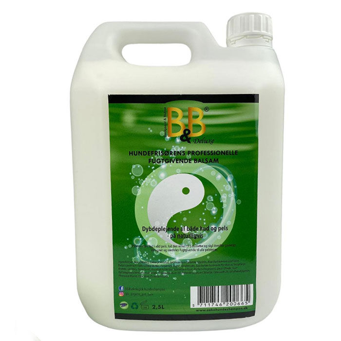 B&B Hundefrisørens Professionelle fugtgivende balsam er udviklet som en dybdeplejene luksusbalsam til den trætte, slidte pels, der trænger til maximal fugt, eller blot som en luksuriøs booster til den kræsne hundeejer.