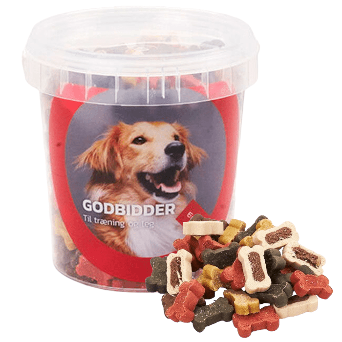 Godbidderne leveres i en plastspand, som lukker tæt og sørger for, at de lækre bidder holder sig friske længere efter åbning. Spanden indeholder 500 g, og du og din firbenede ven kan derfor nå at øve mange tricks, før I løber tør.