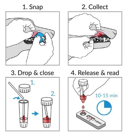 Testen baseres på en enkelt dråbe blod, du hurtigt og smertefrit udtager fra tæven ved hjælp af den medfølgende prøvesonde.