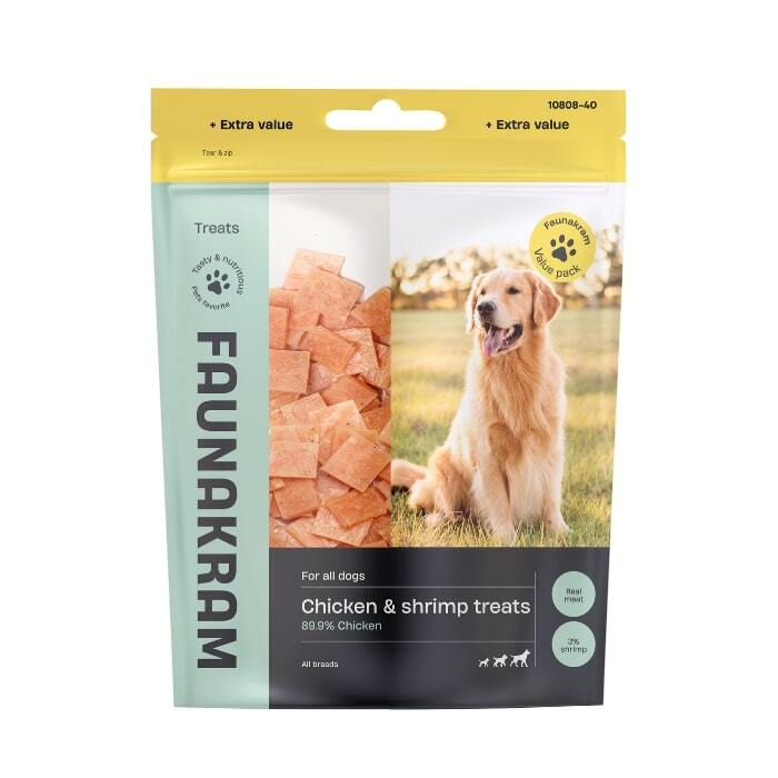 Lækre semi-moist hundegodbidder med kylling og rejer.