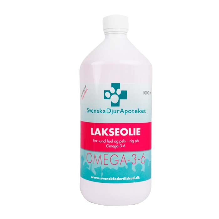 Koldpresset lakseolie fra Svenska DjurApoteket. Lavet med frisk kvalitetslaks fra Norge, et tilskudsfoder der kan bidrage til flot hud og pels.
