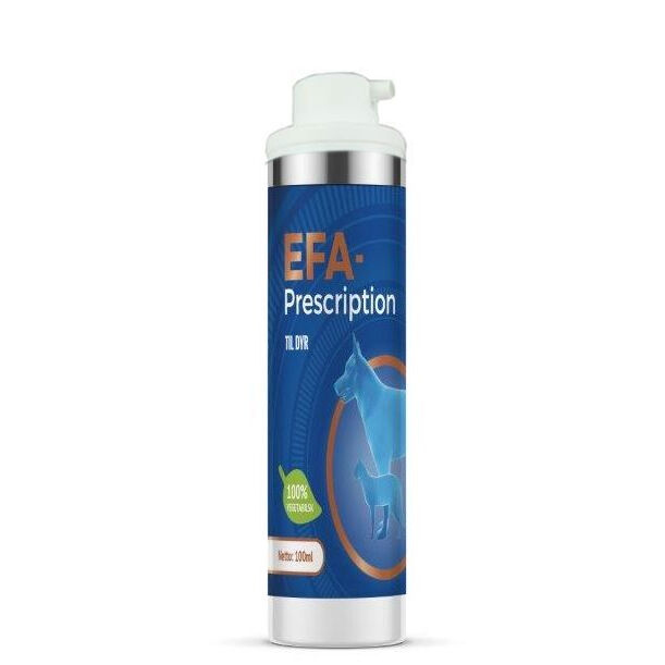 EFA-Prescription er et vegansk fodertilskud til hunde og katte bestående af koldpressede plantefrøolier fra tranebær og hjulkrone. Tilskuddet er rigt på omega-3 og 6 samt naturligt E-vitamin og antioxidanter.