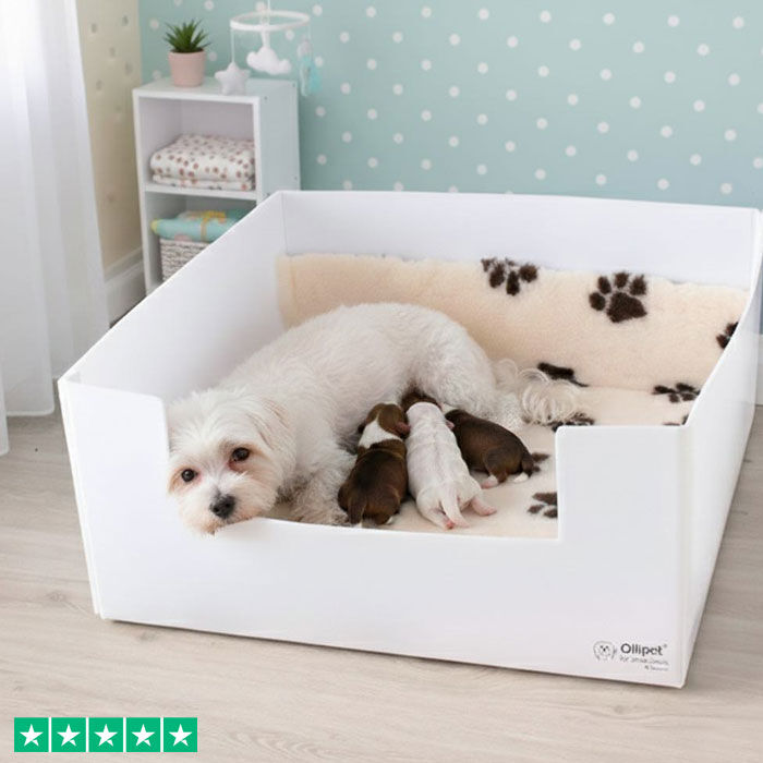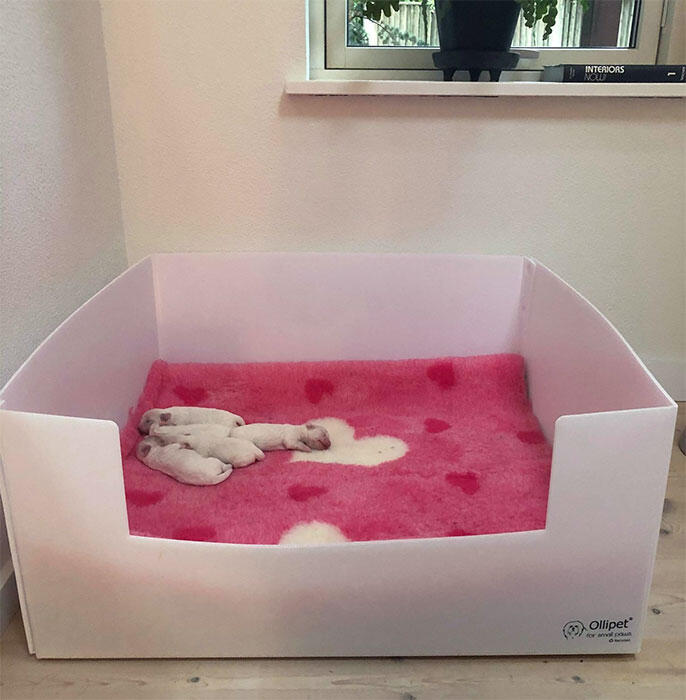 Vi anbefaler at lægge et tisseunderlag i bunden af fødekassen og derpå et lækkert vetbed tæppe. Nu er fødekassen klar til at danne rammerne om hvalpenes første lille hjem fra de fødes og til de er 3-4 uger gamle.
