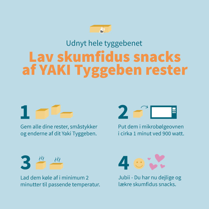 Når Yaki tyggebenet er tygget godt i bund, kan du tage ende stykket, og lægge i mikroovnen ved 800-900W i ca. halvandet minut. Det vil få stykket til at poppe op. Tag det poppede stykke ud af mikrobølgeovnen, og lad det afkøle i et par minutter. Derefter kan du give det til hunden, uden fare for at den forsluger sig i det sidste hårde stykke ost.