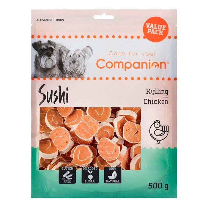 Companion Chicken Sushi er fyldt med kylling sammensat med lidt lækkert torsk. De lugter måske en smule af fisk, men hundene er vilde med det og hvad gør man ikke gerne for vores skønne pelsklumper. De er nemme at tygge hvilket gør dem rigtig gode til hunde i alle aldre og størrelser.