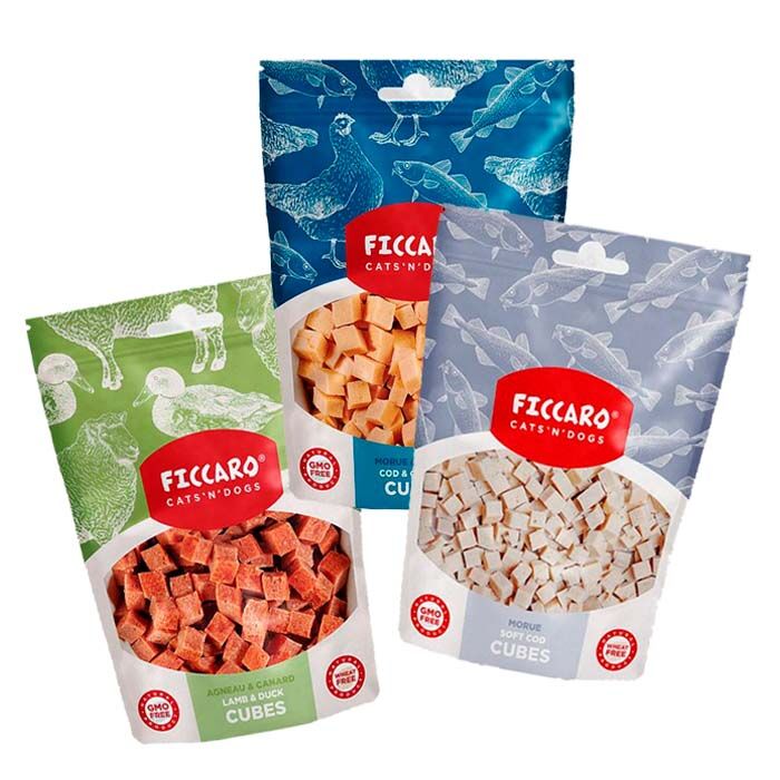 Med Ficcaro Træningspakke #1 kan du tilbyde din hund 3 spændende pakker godbidder fra Ficcaro.