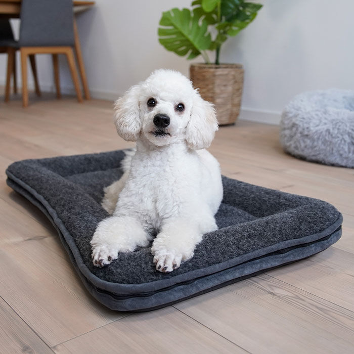 Madrassen passer perfekt ind i de fleste hundebure og egner sig også godt til bilen. Vores hunde nyder dog også madrassen hjemme i stuen.