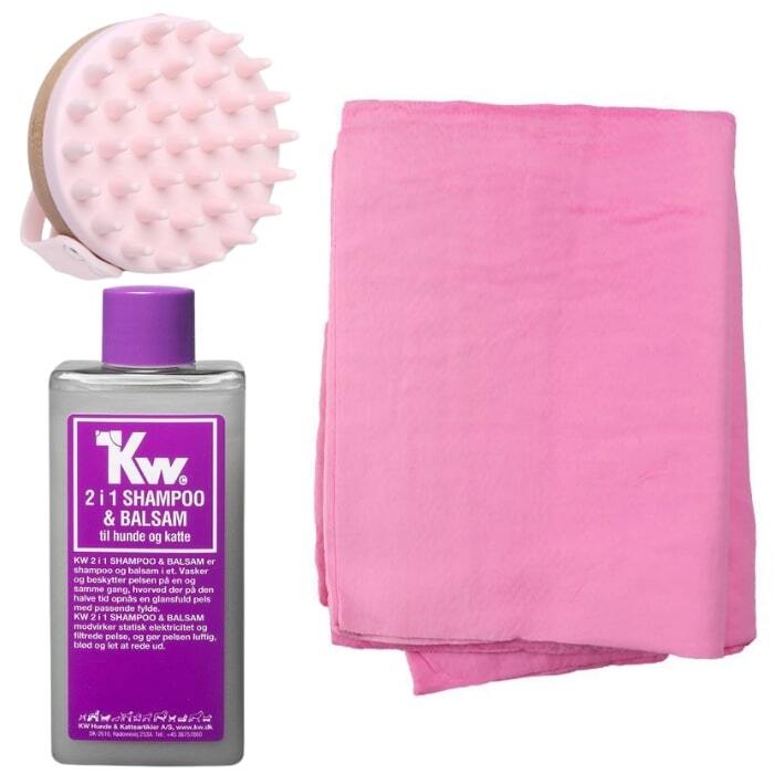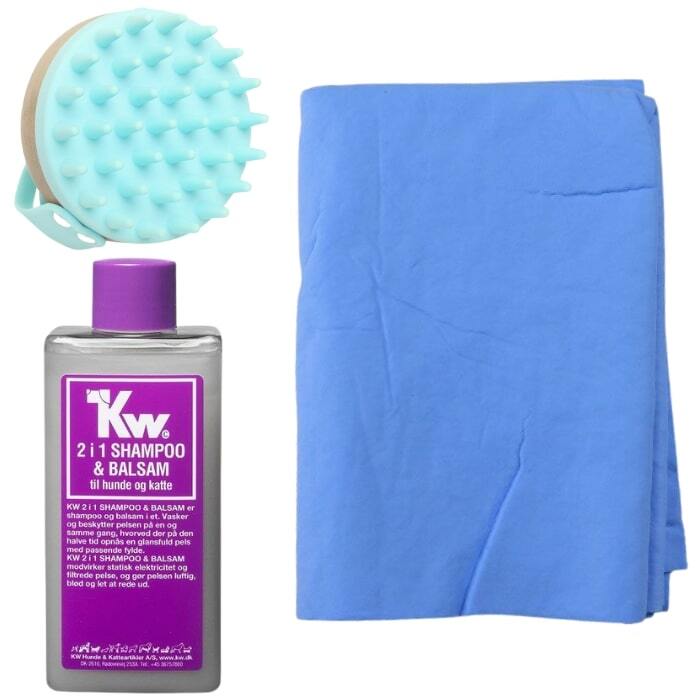 Med dette praktiske pakkesæt får du alt, du har brug for til en komplet og skånsom vask af din hund – uanset om det er en hverdagstur i badet eller efter en mudret gåtur. Sættet består af en effektiv 2i1 shampoo og balsam fra KW, et superabsorberende håndklæde fra Ollipet og en smart massagebørste, der hjælper med både at fordele sæben og stimulere hundens hud. Produkterne er nøje udvalgt til at komplementere hinanden – både i funktion og udtryk – og du kan vælge mellem to matchende farver: blå eller lyserød.