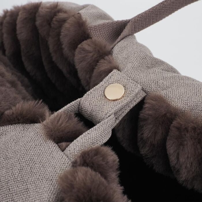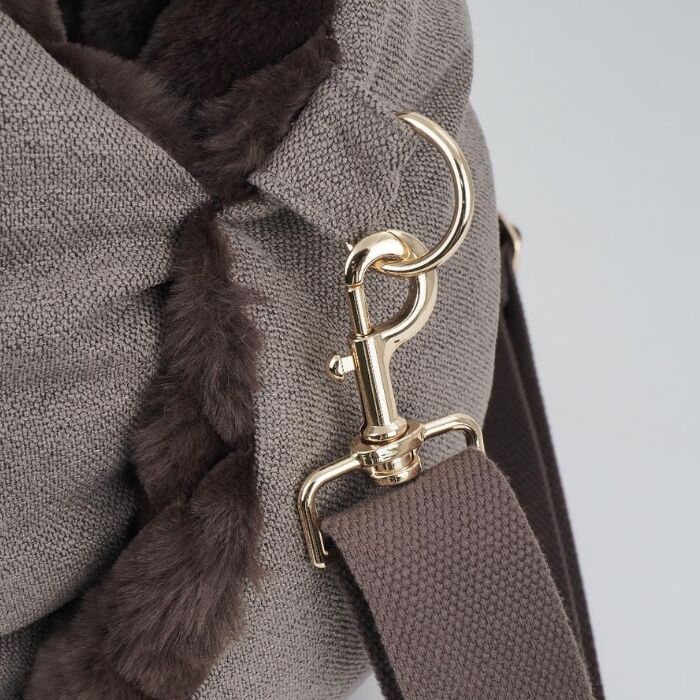 De høje, polstrede sider beskytter mod vind og støj, mens den flotte kombination af grå tekstil og mørkebrun plys giver tasken et eksklusivt look. En perfekt blanding af nordisk design og ren hygge!