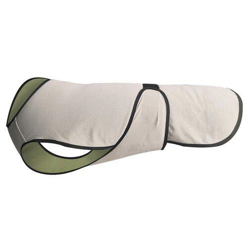Køledækkenet er fremstillet i elastisk og åndbart stof, hvilket gør at hunden nærmest ikke mærker at den har dækkenet på.