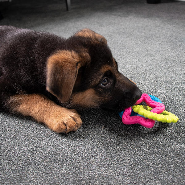 Når en hvalp tygger på legetøj, hjælper det med at lindre ubehag fra tandskifte og styrker kæbemusklerne.