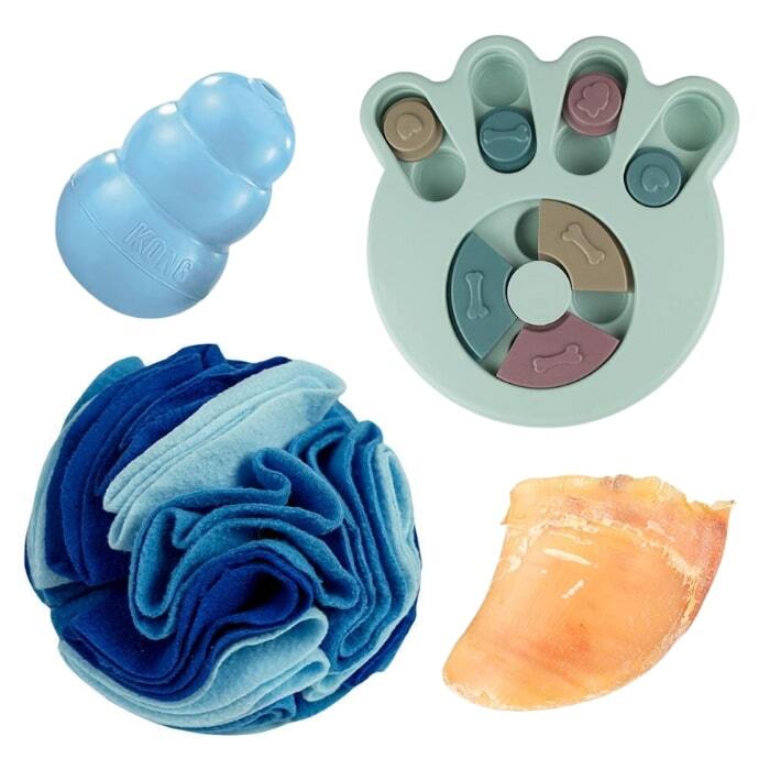 Perfekt startsæt til den nysgerrige hanhvalp– med både tyggevenlig snack og stimulerende aktivitetslegetøj.
