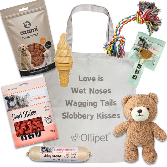 Forkæl din hund med denne lækre gavepakke – fyldt med godbidder, legetøj og et stilfuldt Ollipet net!