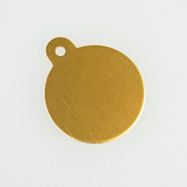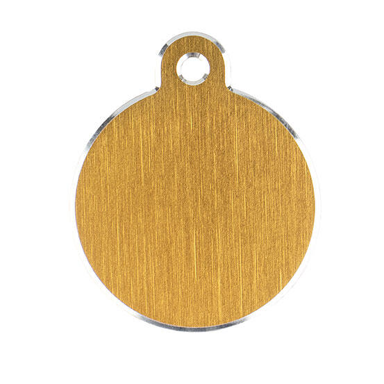 Elegant hundetegn i guldfarve, med sølvfarvet kant, i letvægts aluminium.