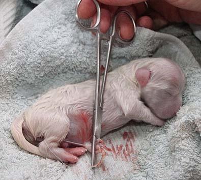 Bider tæven ikke selv navlestrengen over, kan du enten klippe den over med en steril saks ca. 2-3 cm fra hvalpens mave, eller du kan rive den over med dine fingre. Når du river den over, minder det mest om den måde, tæven bide navnestrengen over på, og er derfor den bedste måde at gøre det på.