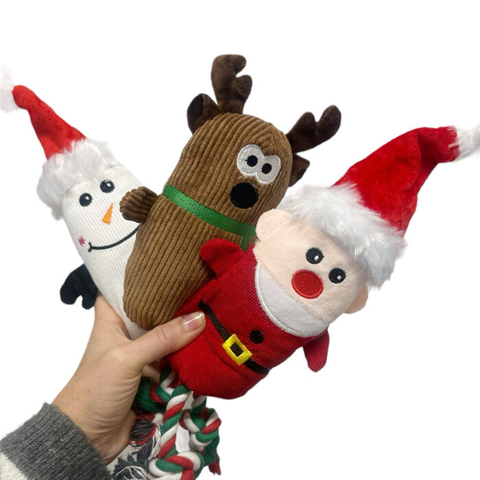 Glæd din hund og skab en ekstra festlig atmosfære med vores OIlipet Julebamser med reb. Disse charmerende legetøjsbamser fås i tre sjove varianter - en nuttet snemand, en festlig julemand og et kærligt rensdyr, der alle tilføjer en ekstra dosis julemagi til din hunds legeunivers.