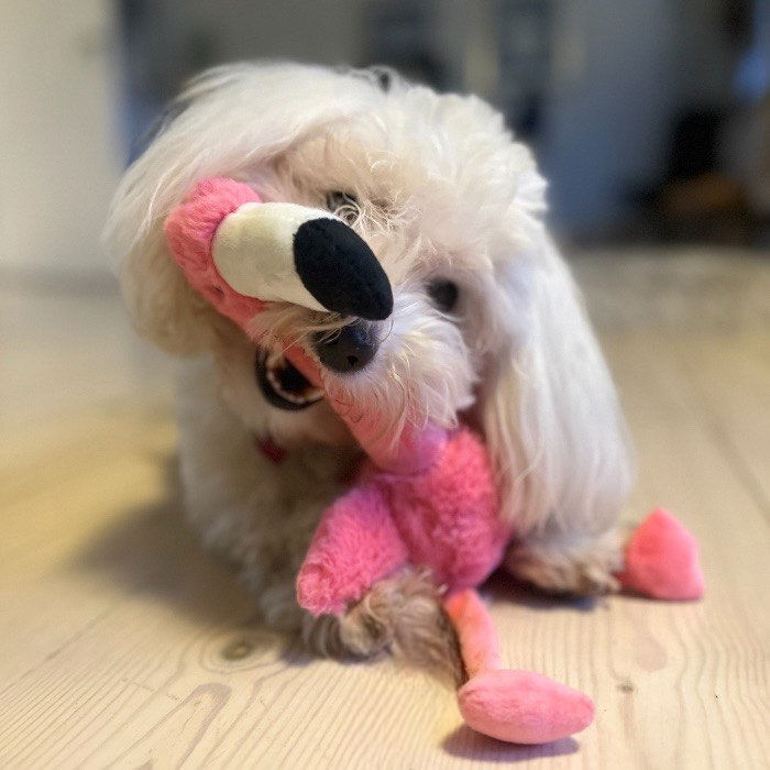 Flamingoen er fremstillet i flotte pink materialer, der alle er bløde og lækre. Halsen er fast, hvorimod benene og vingerne blafre og slasker, når din hund leger med den.