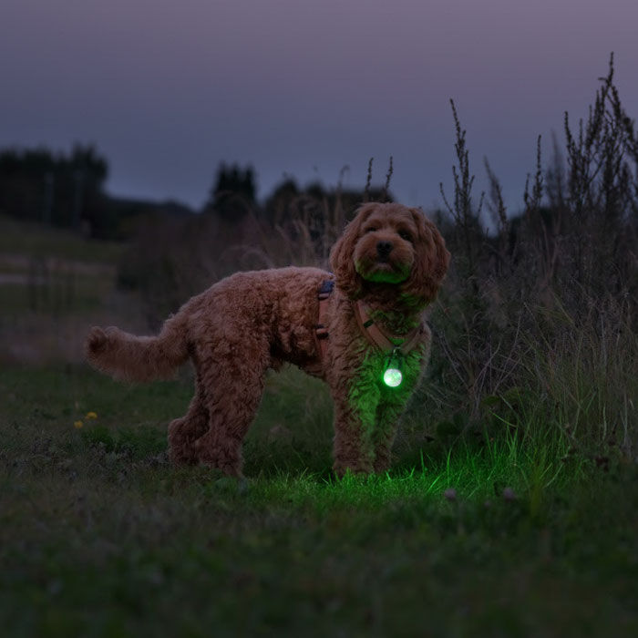 Med en Ollipet Night Glow LED lygte gør du din hund synlig i mørket