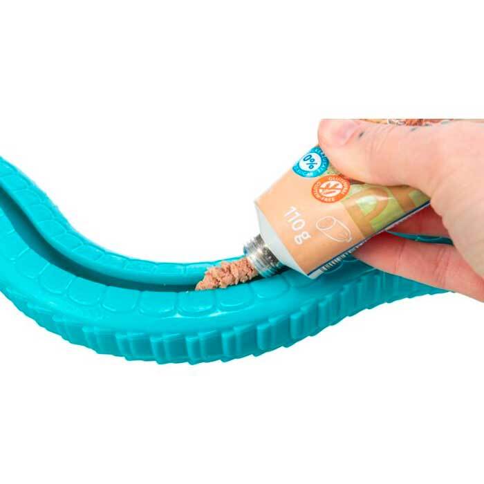På Snack Slangens underside er der en lang slids, hvor du kan komme godbidder, vådfoder eller paté i. Lad din hund arbejde for, at få det ud - så bliver den lille sult stillet og den aktiveres samtidig.