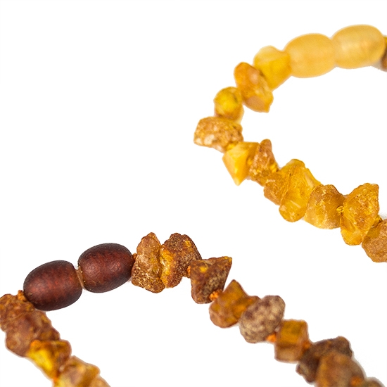 Smukt halsbånd med rå ravstykker og læderspænde der afskrækker lopper og flåter