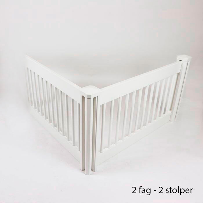 - 2 fag: Denne løsning passer kun hvis du allerede har fødekassen + "3 fag". Med 2 yderligere fag kan du gøre fødekassen + kravlegården endnu større. Denne løsning + fødekasse + "3 fag" giver et samlet mål på 240 x (80 eller 100 cm) x 46 cm. De to ekstra fag kan enten bruges i forlængelse eller som en vinkel.- Du modtager 2 fag med 12 stk pinde i hver samt 2 samlestolper.