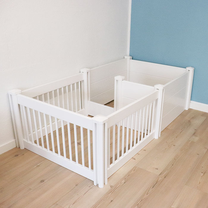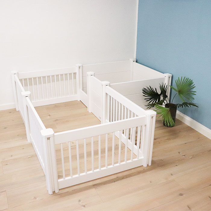 Med denne løsning har du altid mulighed for at tilkøbe ekstra fag og derved udvide kravlegården. Tremmerne kan nemt fjernes hvis man ønsker at lave en ind-/udgang.