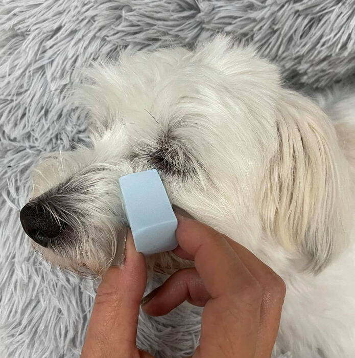 Døjer din hund f.eks. med tårestriber/løbeøjne, kan du med fordel påføre øjenplejeprodukter med denne svamp.