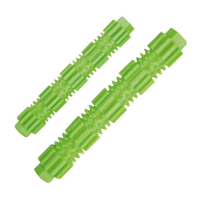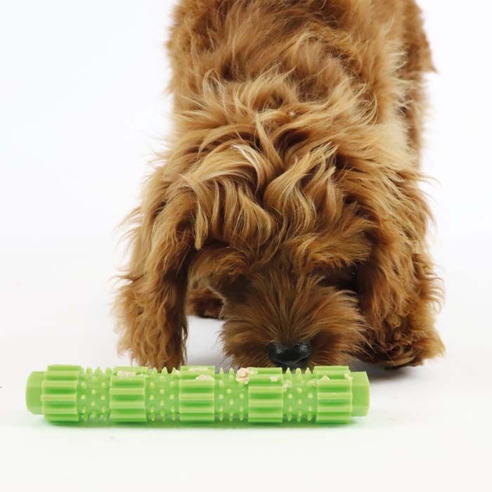Den aflange stick er fyldt med sjove gummidupper i forskellige former, der masserer gummerne, og er tandrensende (også de bagerste kindtænder) når hunden gnaver i den.