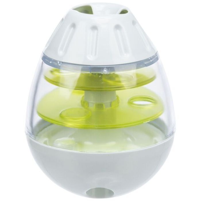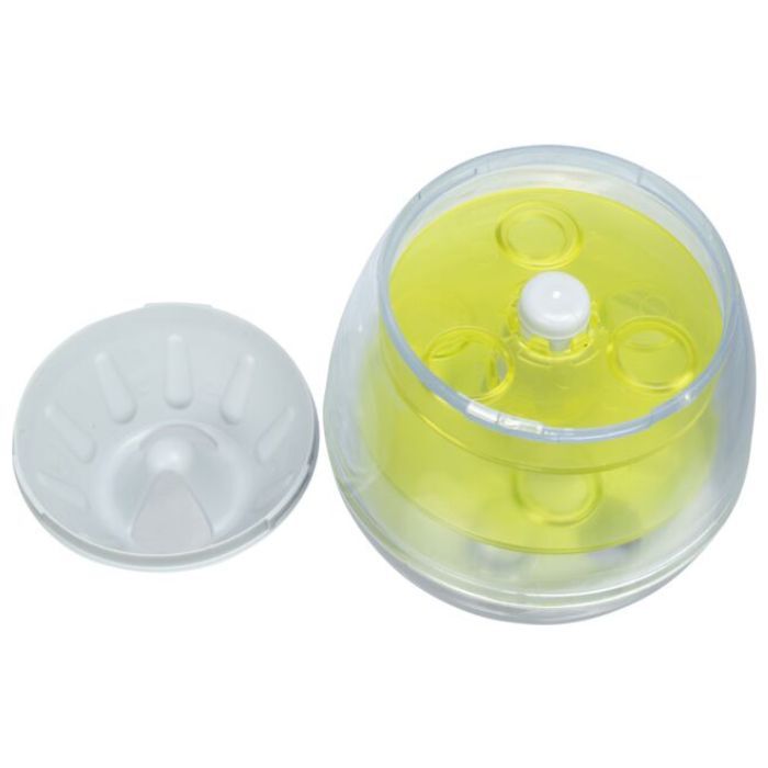 Trixie Roly Poly Snackæg er produceret i plastik, og indvendigt findes 4 udtagelige plader, med forskudte åbninger, som du selv kan regulere for at bestemme, hvor mange godbidder der skal komme ud. Ved at justere på de 4 plader bestemmer du også selv sværhedsgraden på legen.