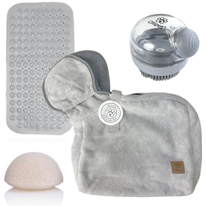Med Badekit – håndklæde, badebørste m.m.får du en komplet og gennemtænkt løsning til din hunds badetid. Sættet består af fire nøje udvalgte produkter, der tilsammen gør det nemt, komfortabelt og hygiejnisk at bade og tørre din hund. Kombinationen af den superabsorberende Ollipet Koala Dry bag, en skridsikker bademåtte, en innovativ badebørste med shampoo-dispenser og en naturlig Konjac vaskesvamp giver dig alt, hvad du skal bruge for at forvandle badetid til kvalitetstid.