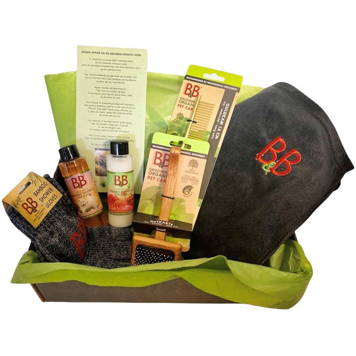 Boksen indeholder alt, hvad du skal bruge, når det kommer til plejen af din hvalps pels: økologisk shampoo og balsam, en kam, en karte, vaskehandsker, et superabsorberende håndklæde samt en udførlig vaskevejledning.