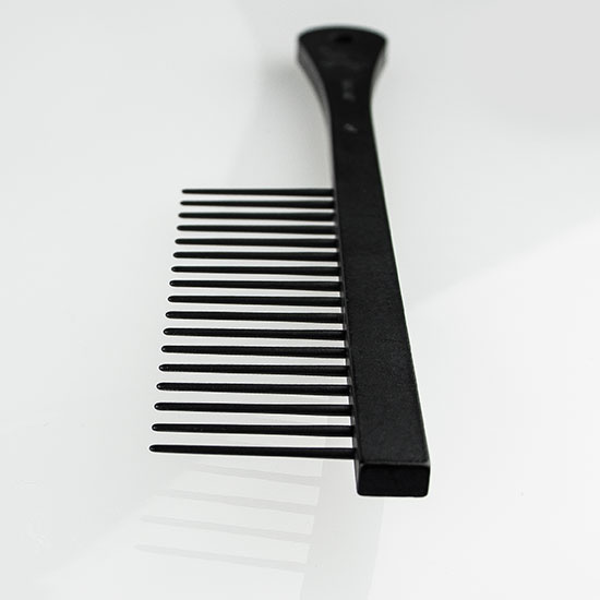 - Kammen der har 63 lange tænder på 15mm fordelt på 7,5 cm. Denne kam er lavet til fjernelse af snavs samt flåter og utøj fra hundens pels. Tæthenden af tænderne er så høj, at den uden problemer fjerner selv loppeæg fra pelsen. Skal udelukkende benyttes i en tør og gennemfriseret pels. Kammens total længde er 16 cm.