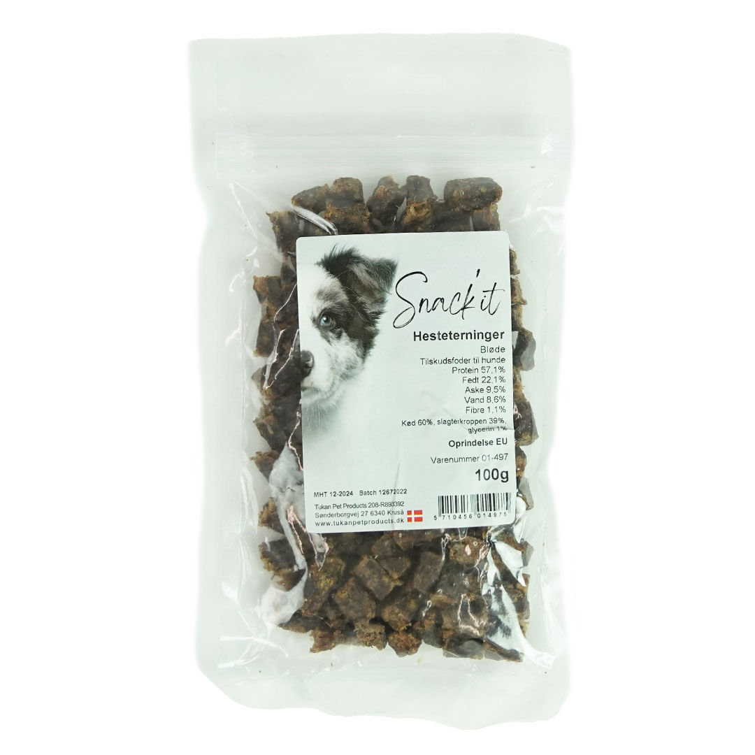 Snack'it Hesteterninger er en lille semiblød godbid der egner sig specielt godt hundetræning. De er forholdsvis nemme for hunden at tygge og let fordøjelige. Størrelsen passer til både små og store hunderacer ( ved meget små hunde kan du med fordel lige skære dem over en enkelt gang).
