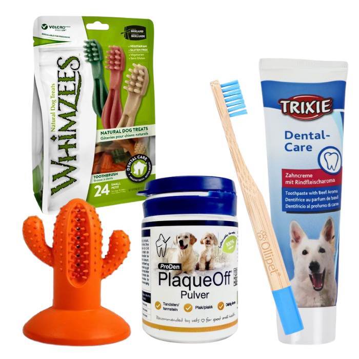 - Plaque Off Pulver: Et naturligt supplement, der tilsættes til hundens mad for at reducere tandsten og plak.