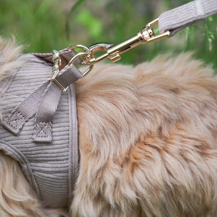Den er fremstillet i slidstærkt, blødt fløjl og udstyret med en eksklusiv karabinhage og D-ring i gylden finish, som tilføjer et strejf af luksus. Det bløde håndtag ligger behageligt i hånden og sikrer et sikkert greb og god kontrol, uanset hvor turen går hen.