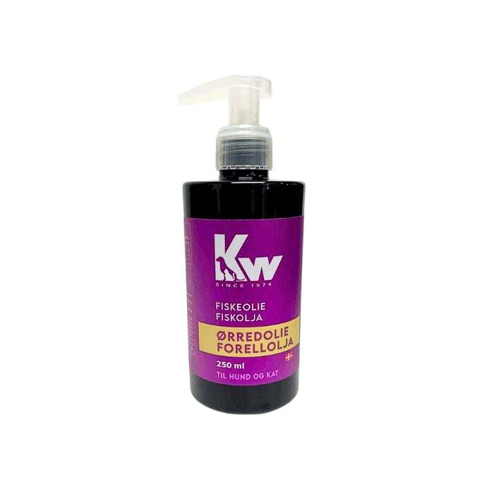 KW Ørredolie er et velsmagende fodertilskud til hunde og katte. Olien er udvundet fra danske regnbueørreder, som er opdrættet i rent, dansk grundvand.