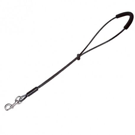 Kraftig strop udført i plastarmeret stålwire med en tykkelse på 5 millimeter. Samlet længde på stroppen er ca. 58 cm. Det er en universalstrop, der fastgøres ved hjælp af en karabinhage og passer på alle trimmebordsgalger. Den glatte overflade gør den behagelig for din hund at have på, samtidigt med at den ikke filtre pelsen.