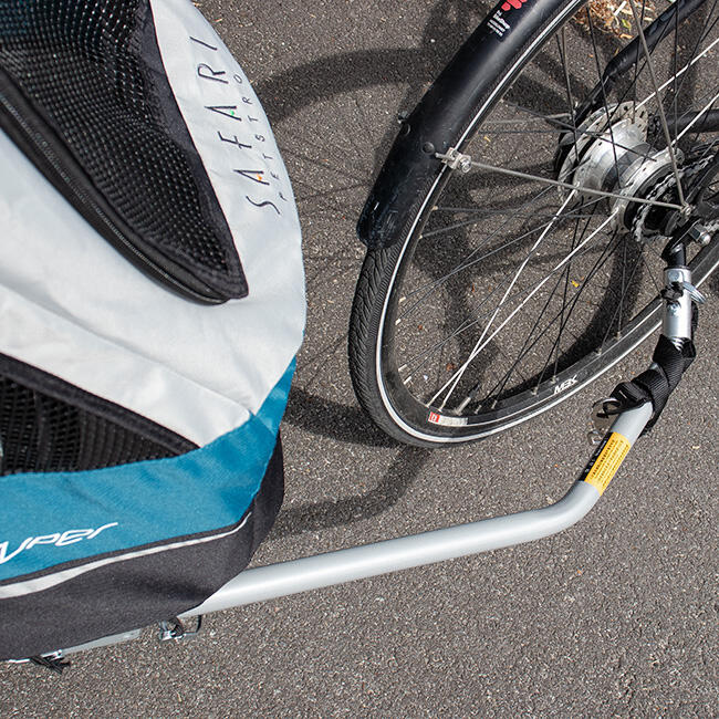 Safari cykeltrailer består af et sæt, hvor du får en standard udstillingsvogn med trimmebordsplade samt et cykelkit, der let monteres via klips under selve udstillingsvognen. Cykelkittet består af to dele, hvor anden del fastgøres til din cykel for eksempel til navet.