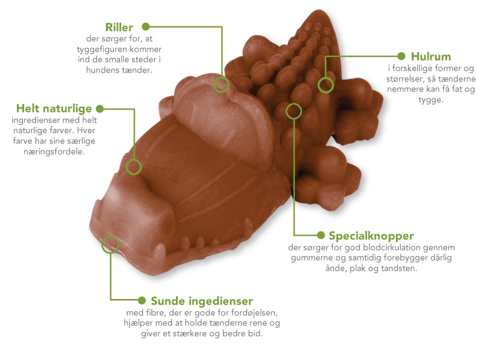 Det anbefales at give 1 tyggefigur i den rette størrelse pr. dag.